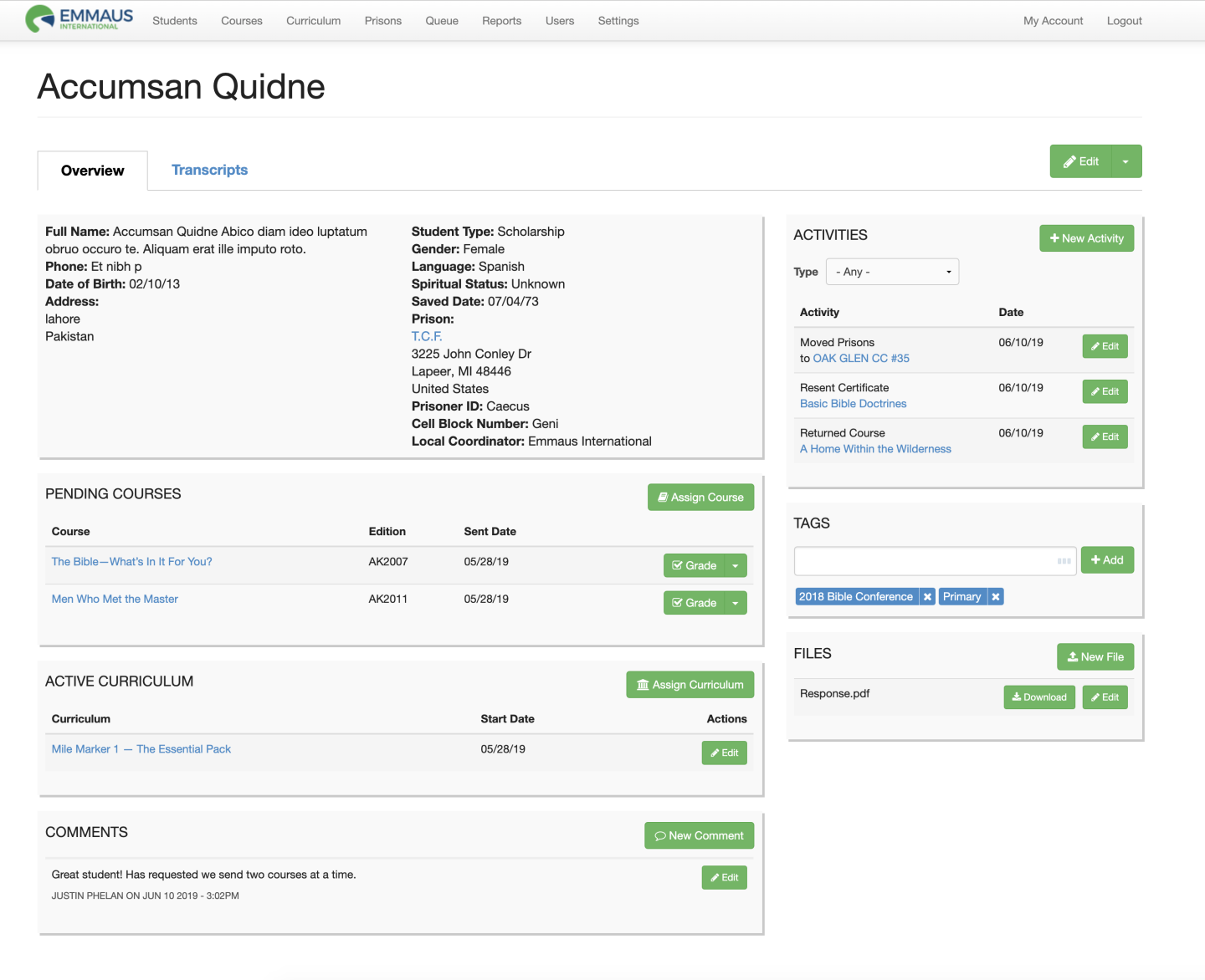 This site is a student management tool built on Drupal 7 and allows multiple ministries to manage their student's progress, assign and mail out courses, grade course progress, print out envelopes for mailings, and generate certificates for finishing courses.